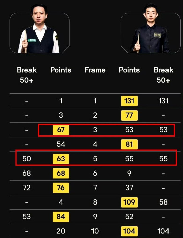 回顾一下肖国栋和吴宜泽的这场比赛,真是跌宕起伏啊。比分是6-5,肖国栋赢了。第一局肖国栋就打出了131分的高分,直接拿下。第二局吴宜泽反击,77-3赢下。第三局肖国栋又以67-53险胜。第四局吴宜泽81-54扳回一城。第五局两人都打出了50+的单杆,最后肖国栋63-55险胜。第六局肖国栋68-9轻松取胜。第七局肖国栋又是72分的高分,76-37赢下。第八局吴宜泽反击,109-4大比分获胜。第九局肖国栋53分的单杆,84-52赢下。第十局吴宜泽104分的高分,104-20扳平比分。最后一局肖国栋73-5拿下胜利。
